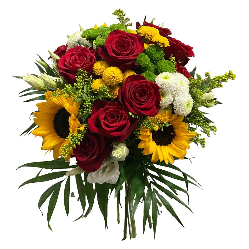 Buchetul este realizat din 9 fire de trandafiri rosii, 2 fire de florea soarelui, 6 fire de santini , 5 fire de eustoma, 3 fire de solidago decorat cu fire de  chico si eucalipt