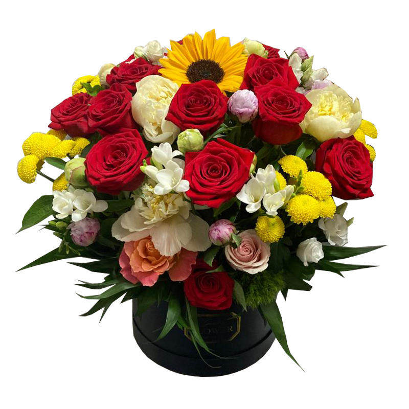 Aranjamentul este realizat din 25 fire trandafiri colorati, 15 fire frezii albe,1 fire floarea-soarelui,13 fire de santini si este decorat cu fire de salal si chico.