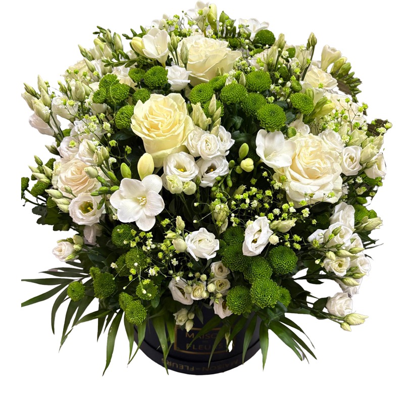 Aranjamentul este realizat din 15 fire trandafiri albi, 20 fire frezii albe, 12 fire eustoma,10 fire de santini verde si este decorat cu fire de salal si chico.